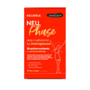 Το Neu Phase της Neubria είναι ένα συμπλήρωμα διατροφής που έχει σχεδιαστεί ειδικά για γυναίκες πριν, κατά τη διάρκεια και μετά την εμμηνόπαυση. Η προηγμένη του φόρμουλα υποστηρίζει τις ειδικές ανάγκες της γυναίκας σε αυτή τη νέα φάση της ζωής της, φροντίζοντας παράλληλα σώμα και μυαλό. Περιέχει βιταμίνες Α, Β, C, D και Ε, μέταλλα, χολίνη, το μείγμα βοτάνων Neu Phase με εκχυλίσματα Dong Quai, Rosemary, Tulsi, Sage, Shatavari και Soy Isoflavones (φυτοοιστρογόνα) και το μείγμα βοτάνων Neu Phase Cogniscence με εκχυλίσματα Bacopa Monnieri, Gotu Kola, Schisandra, Blueberry, Rhodiola Rosea και Green Tea.